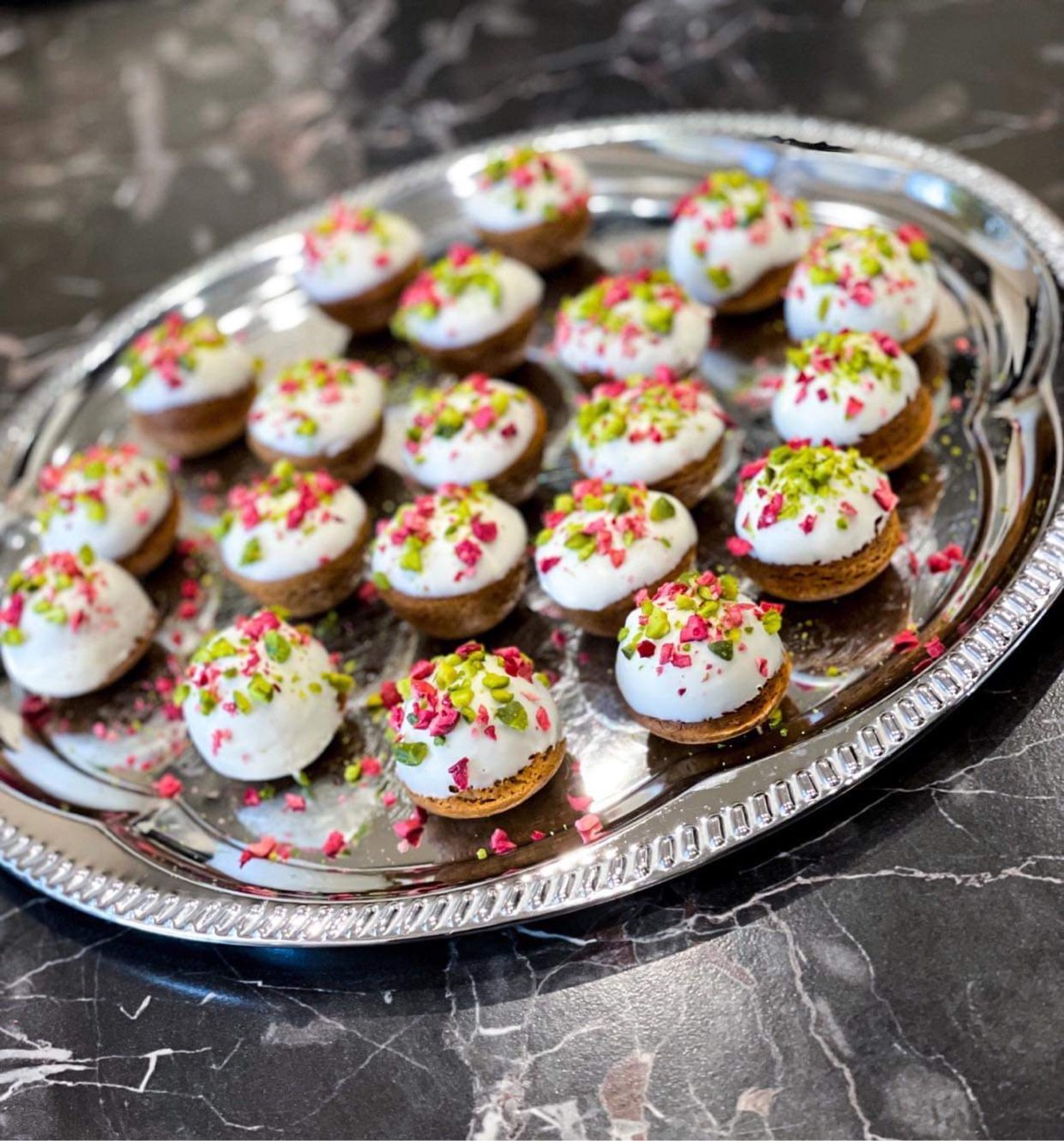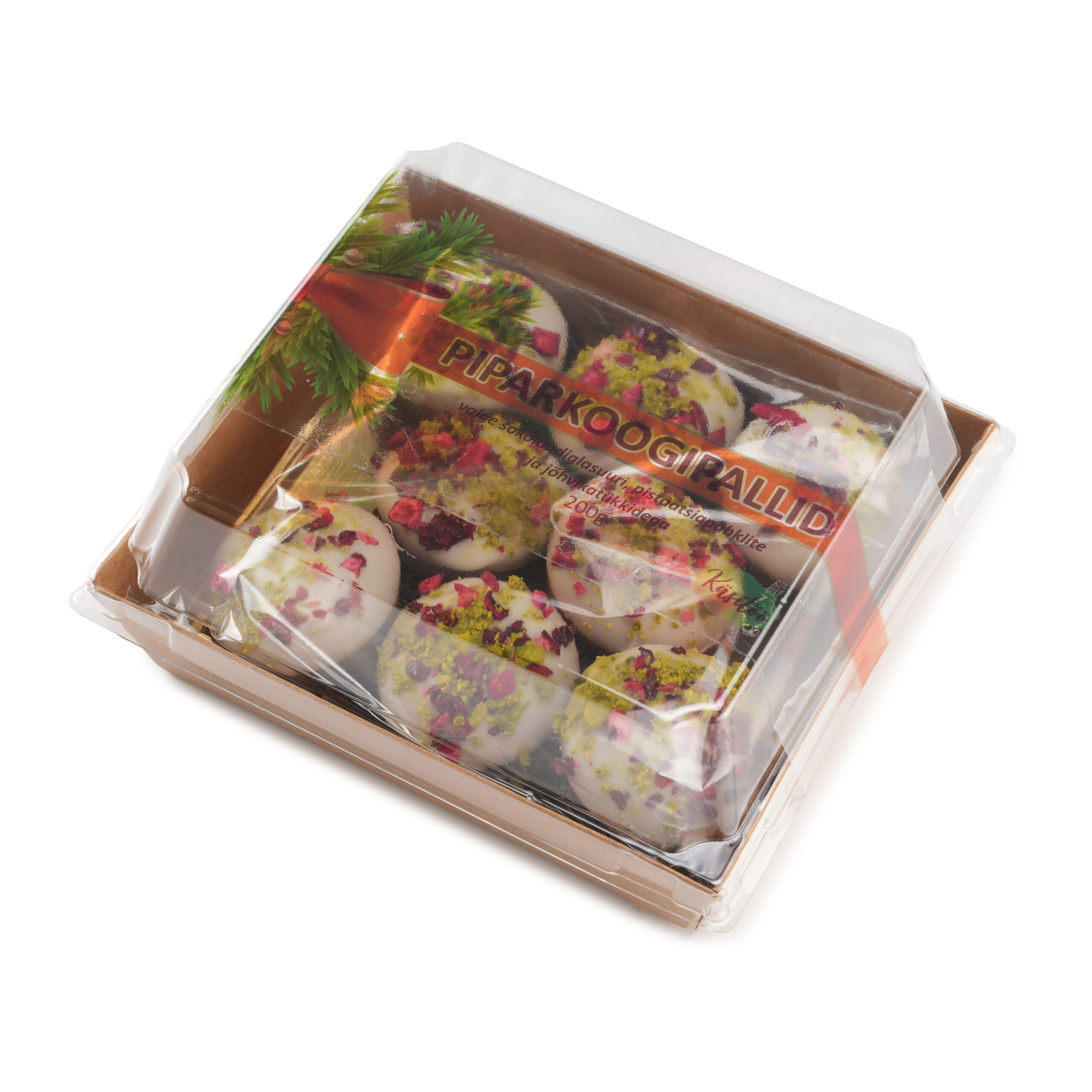 Piparkoogipallid valge šokolaadiglasuuri, pistaatsiapähklite ja jõhvikatükkidega.